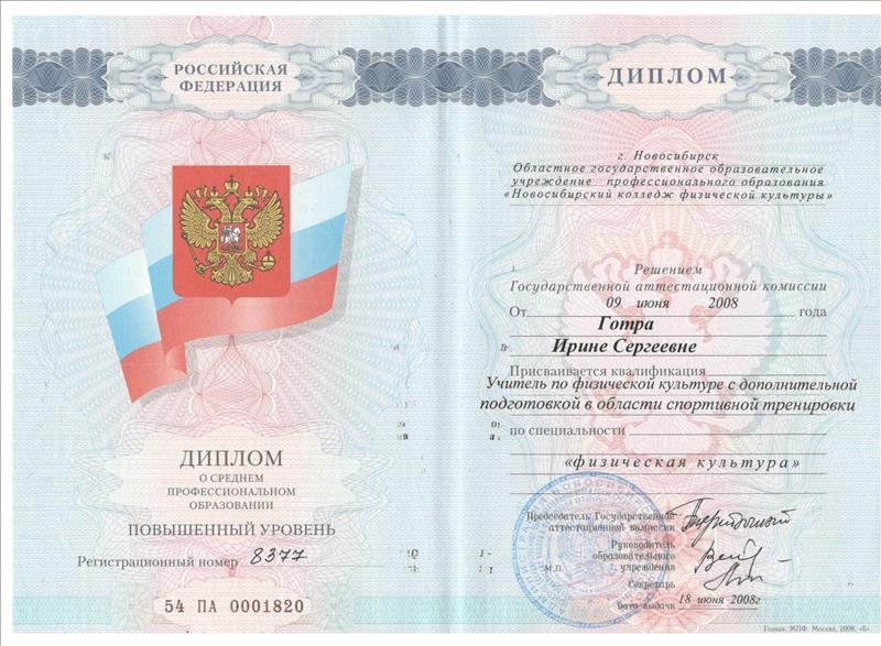 | Диплом учителя по физической культуре с дополнительной подготовкой в области спортивной тренировки (повышенный уровень) | г.Новосибирск Областное государственное образовательное учреждение профессионального образования "Новосибирский колледж физической культуры" | 09.06.2008 | Файл |