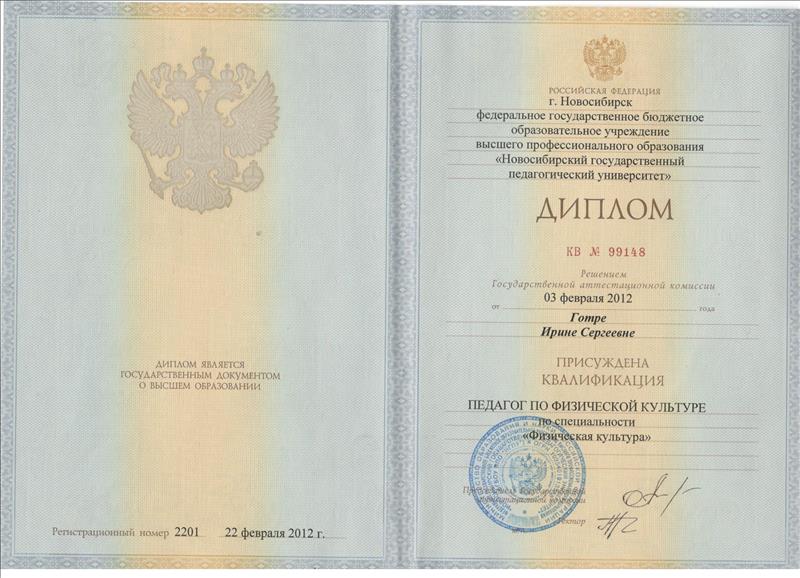 | Диплом педагога по физической культуре | г.Новосибирск Федеральное государственное бюджетное образовательное учреждение высшего профессионального образования "Новосибирский государственный педагогический университет" | 03.02.2012 | Файл |