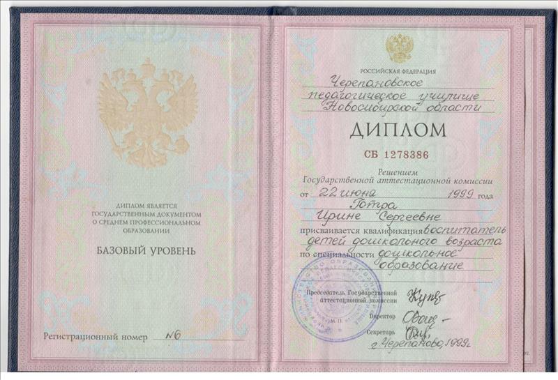 | диплом воспитателя детей дошкольного возраста | Черепановское педагогическое училище Новосибирской области | 22.06.1999 | Файл |