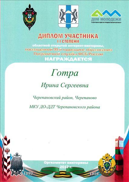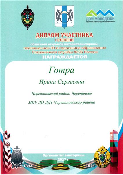| Областная открытая интернет - викторина, посвящённая 99-й годовщине образования Пограничной службы ФСБ России | ... | 03.03.2017 | 07.04.2017 | Диплом участника 1 степени, Диплом участника 2 степени | Файл |