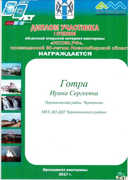 Диплом участника 1 степени областной интернет - викторины "НСО80.РФ", посвящённой 80 -летию Новосибирской области