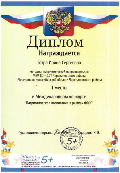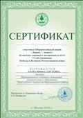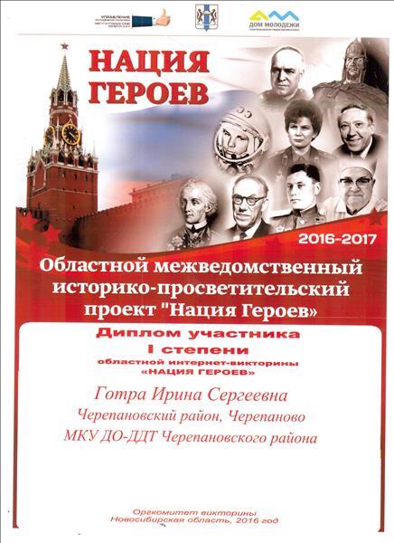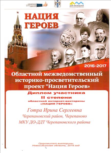 | Областной межведомственный историко-просветительский проект "Нация Героев" | ... | 05.09.2016 | 09.12.2016 | диплом участника 1 степени, диплом участника 2 степени | Файл |
