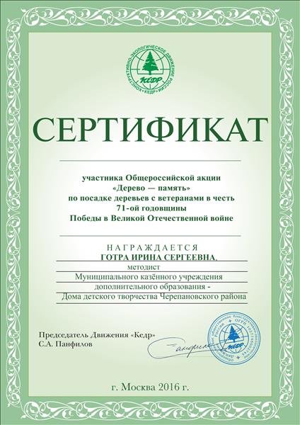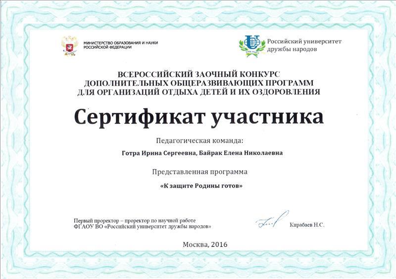 | Всероссийский заочный конкурс дополнительных общеразвивающих программ для организаций отдыха детей и их оздоровления | ... | 01.09.2016 | 23.09.2016 | сертификат участника | Файл |
