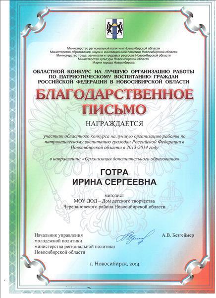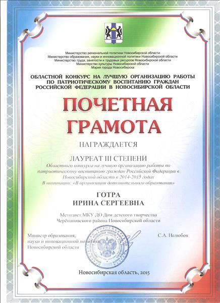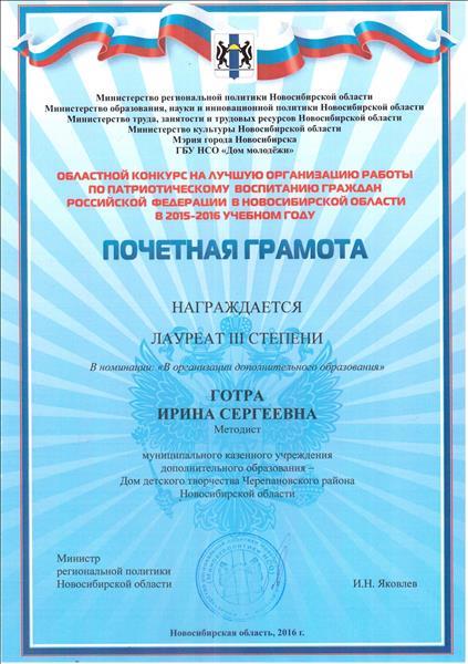 | Областной конкурс на лучшую организацию работы по патриотическому воспитанию граждан в 2015-2016 учебном году | ... | 15.09.2016 | 14.10.2016 | почётная грамота лауреата 3 степени | Файл |