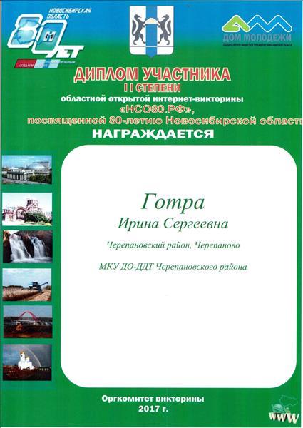 Диплом участника 2 степени областной интернет - викторины "НСО80.РФ", посвящённой 80 -летию Новосибирской области