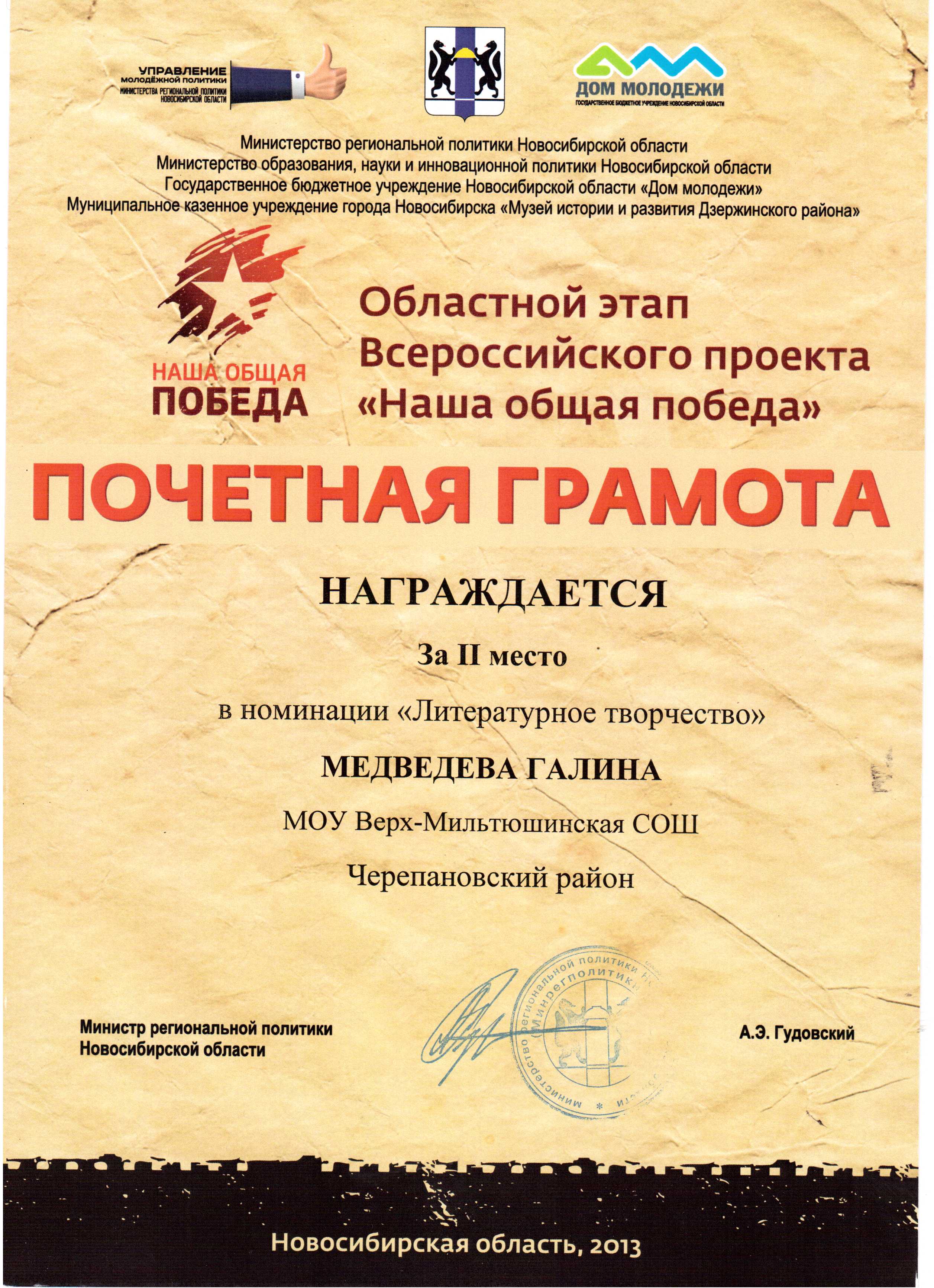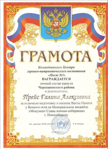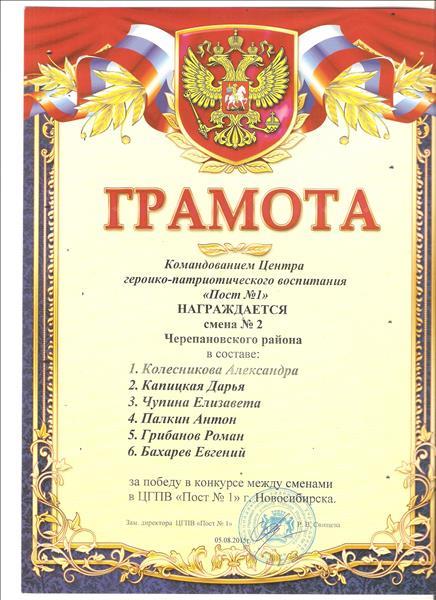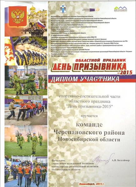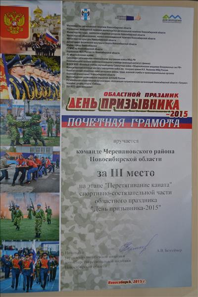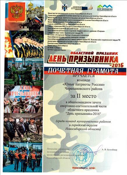 Почётная грамота за 2 место в общекомандном зачёте спортивно-состязательной части областного праздника "День призывника-2016"