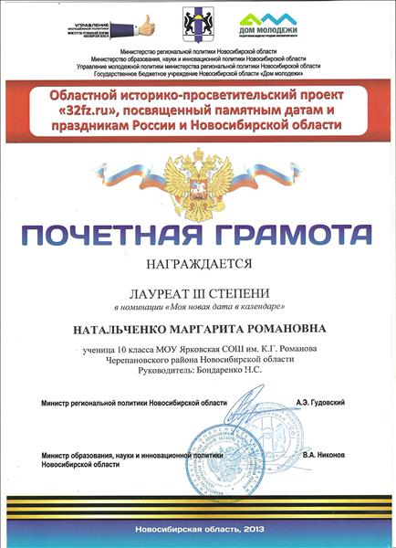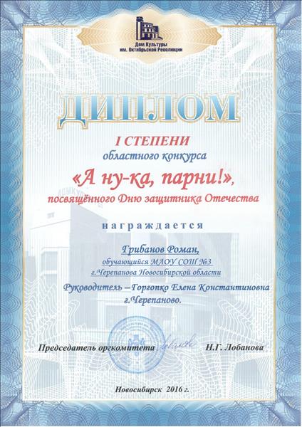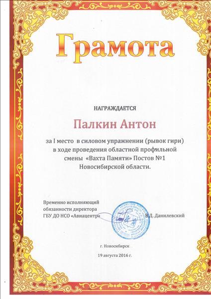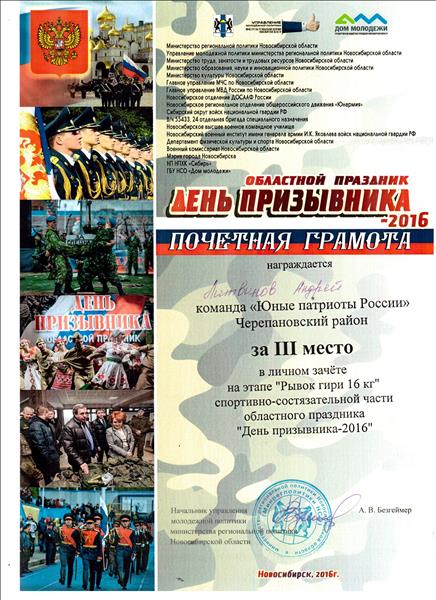 Почётная грамота за 3 место в личном зачёте на этапе "Рывок гири 16 кг" спортивно-состязательной части областного праздника "День призывника-2016"