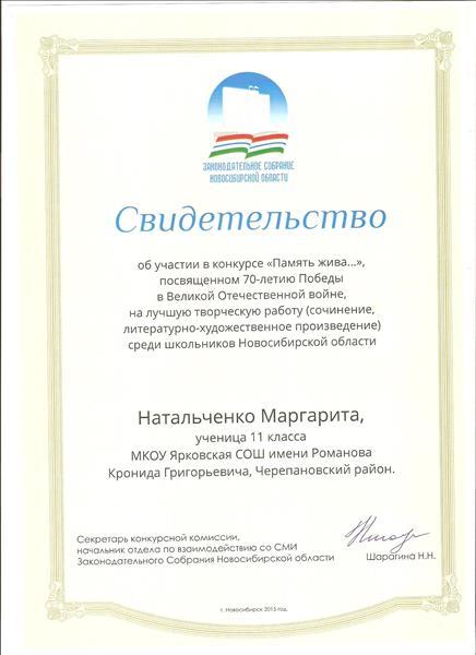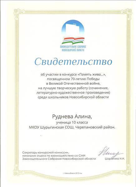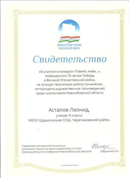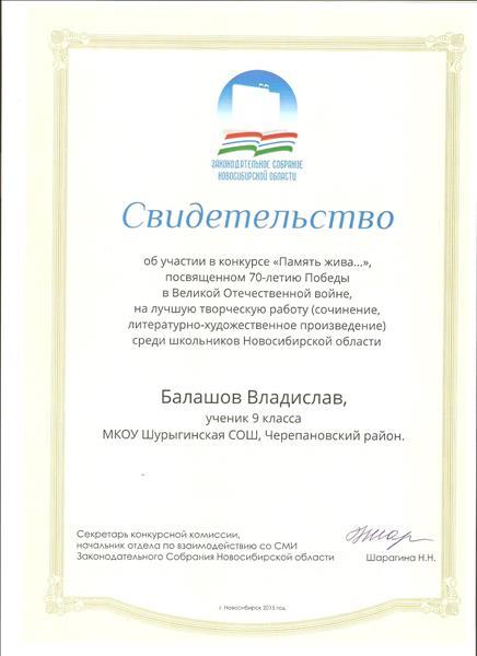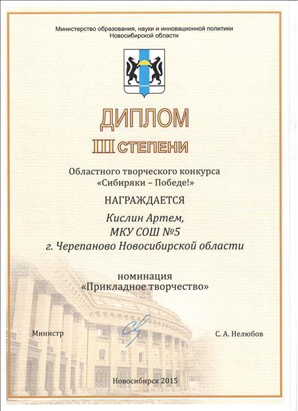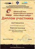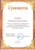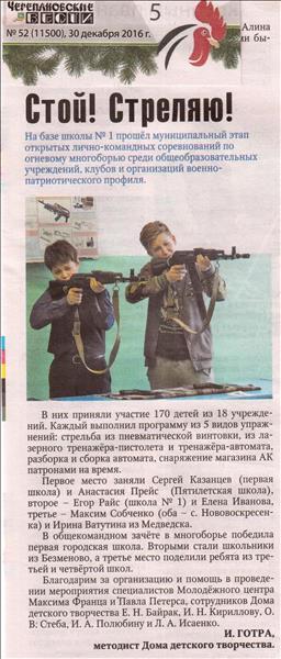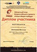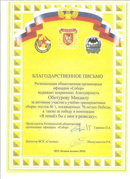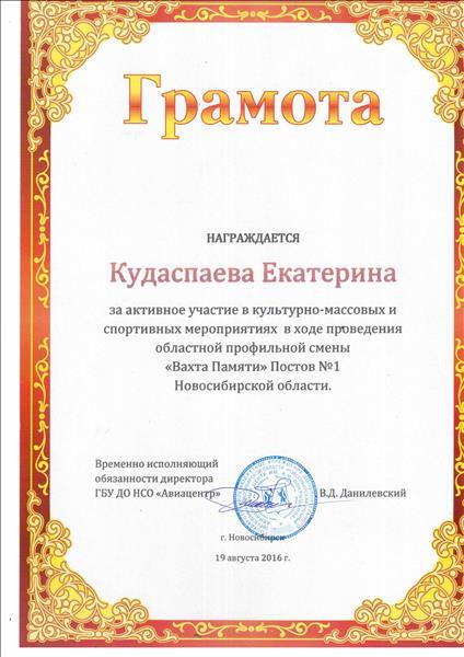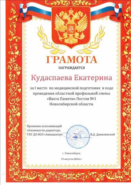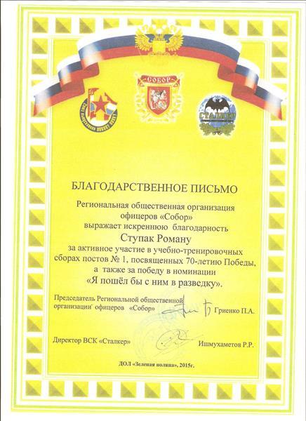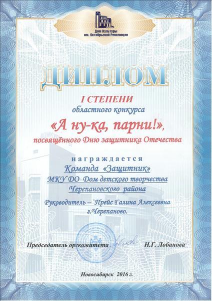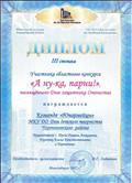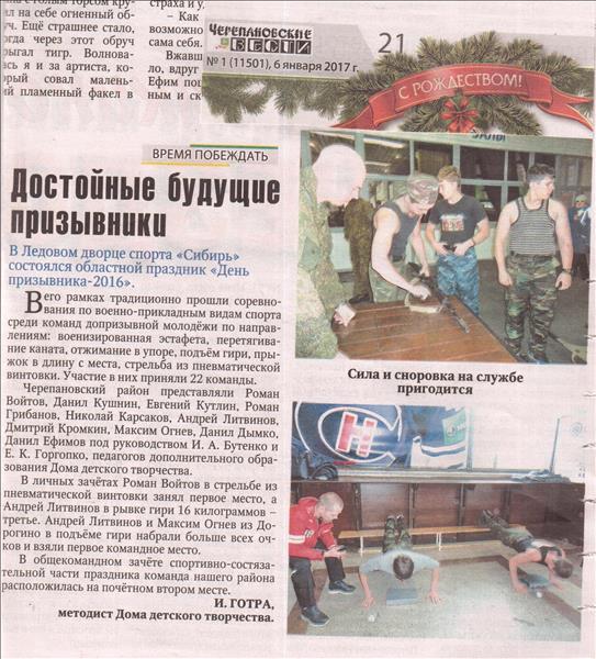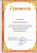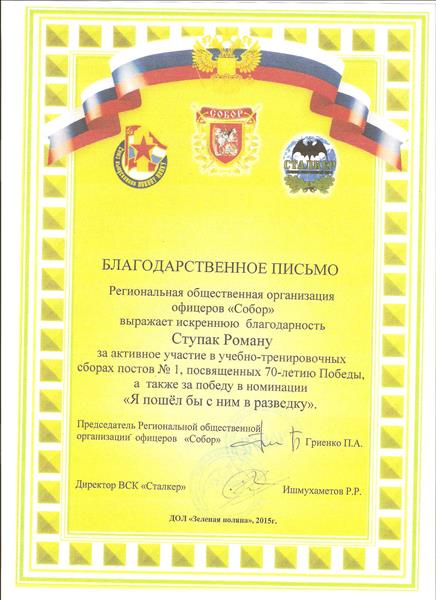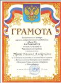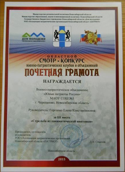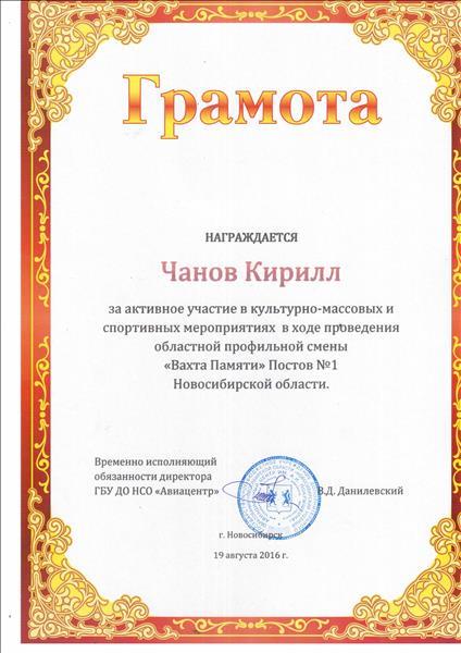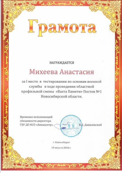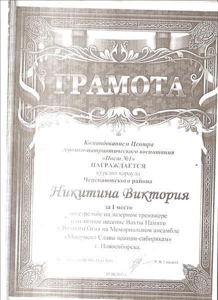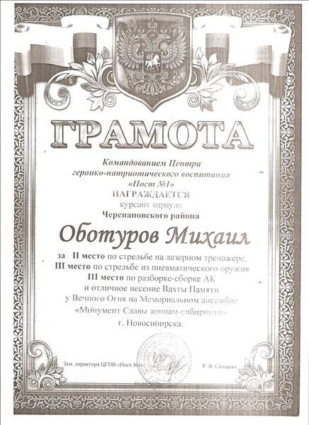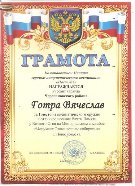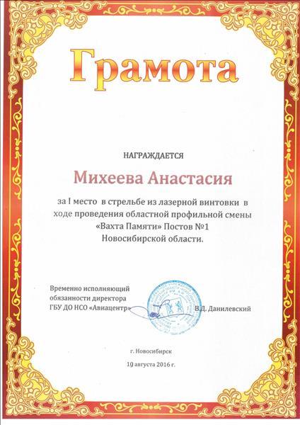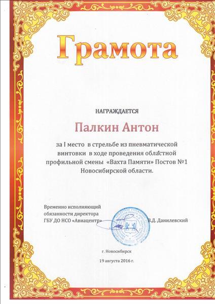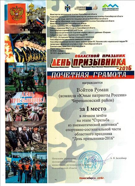 Почётная грамота за 1 место в личном зачёте на этапе "Стрельба из пневматической винтовки" спортивно-состязательной части областного праздника "День призывника-2016"